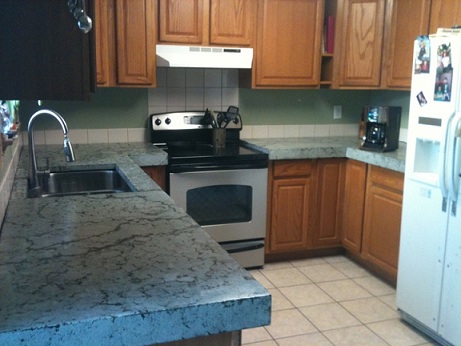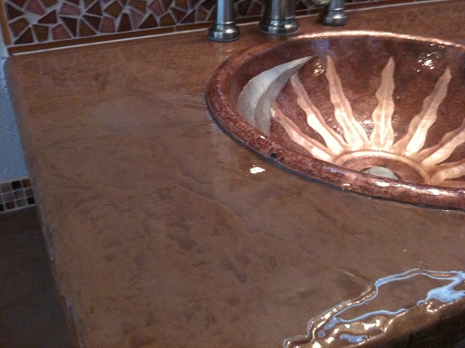 Cast in place is just that, poured right there in place on the cabinets. These counters are usually hard trowelled. The cream is trowelled to a fine finish.It often shows the expert hand of the artisian. |